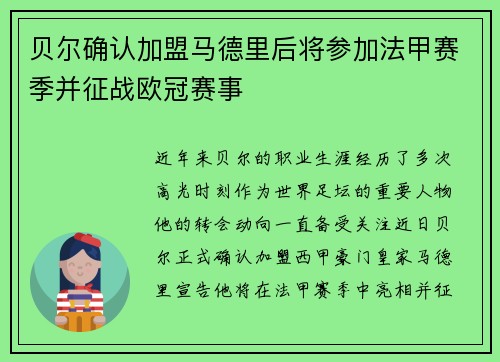 近年来,贝尔的职业生涯经历了多次高光时刻,作为世界足坛的重要人物,他的转会动向一直备受关注。近日,贝尔正式确认加盟西甲豪门皇家马德里,宣告他将在法甲赛季中亮相并征战欧冠赛事。这一决定不仅对贝尔的职业生...