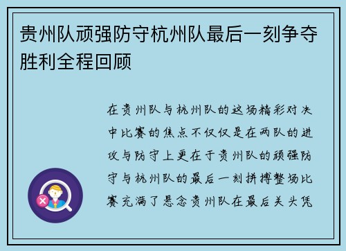 在贵州队与杭州队的这场精彩对决中,比赛的焦点不仅仅是在两队的进攻与防守上,更在于贵州队的顽强防守与杭州队的最后一刻拼搏。整场比赛充满了悬念,贵州队在最后关头凭借坚强的防守,成功抵挡住了杭州队的猛烈进攻...