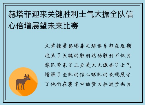 文章摘要: 赫塔菲足球俱乐部在近期迎来了关键的胜利,这场胜利不仅为球队带来了三分,更大大振奋了士气,增强了全队的信心。球队的表现展示了他们在赛季中的努力和进步,也为接下来的比赛奠定了良好的基础。文章将...
