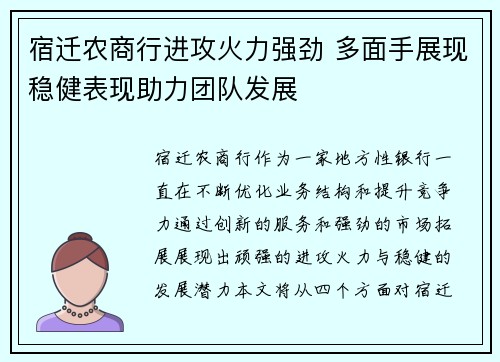 宿迁农商行作为一家地方性银行,一直在不断优化业务结构和提升竞争力,通过创新的服务和强劲的市场拓展,展现出顽强的进攻火力与稳健的发展潜力。本文将从四个方面对宿迁农商行的成功经验进行详细分析,包括其市场拓...