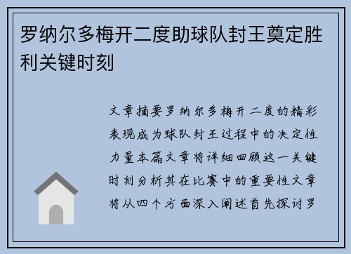 文章摘要:罗纳尔多梅开二度的精彩表现,成为球队封王过程中的决定性力量。本篇文章将详细回顾这一关键时刻,分析其在比赛中的重要性。文章将从四个方面深入阐述,首先探讨罗纳尔多的个人技术如何突破对方防线,其次...