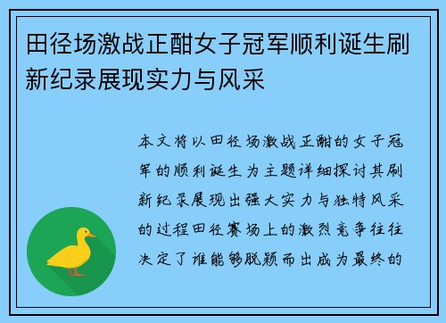 本文将以田径场激战正酣的女子冠军的顺利诞生为主题,详细探讨其刷新纪录、展现出强大实力与独特风采的过程。田径赛场上的激烈竞争,往往决定了谁能够脱颖而出成为最终的冠军。而在这场竞争中,不仅仅是运动员的拼搏...