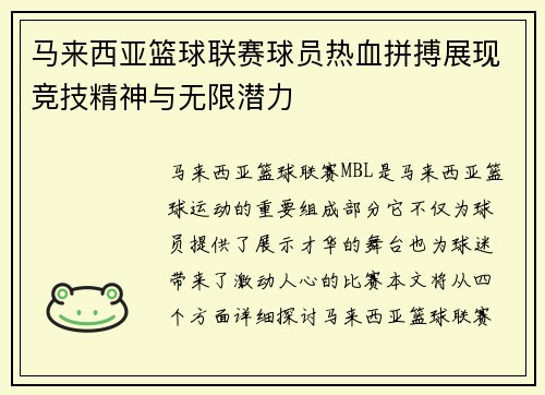 马来西亚篮球联赛(MBL)是马来西亚篮球运动的重要组成部分,它不仅为球员提供了展示才华的舞台,也为球迷带来了激动人心的比赛。本文将从四个方面详细探讨马来西亚篮球联赛球员如何通过热血拼搏展现竞技精神与无...