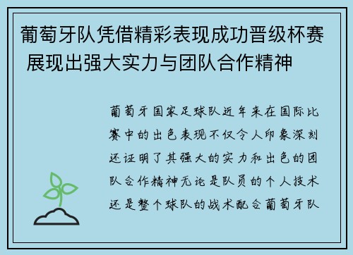 葡萄牙国家足球队近年来在国际比赛中的出色表现,不仅令人印象深刻,还证明了其强大的实力和出色的团队合作精神。无论是队员的个人技术,还是整个球队的战术配合,葡萄牙队无疑是当今足球世界中最具竞争力的球队之一...