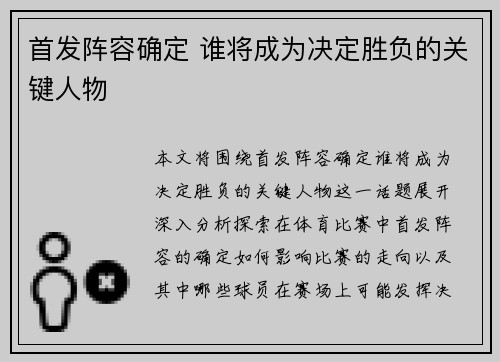 本文将围绕“首发阵容确定,谁将成为决定胜负的关键人物”这一话题展开深入分析,探索在体育比赛中首发阵容的确定如何影响比赛的走向,以及其中哪些球员在赛场上可能发挥决定性作用。文章将从四个方面进行详细阐述:...
