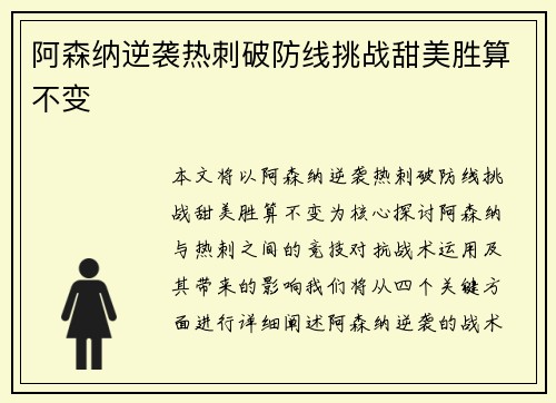 本文将以“阿森纳逆袭热刺破防线挑战甜美胜算不变”为核心,探讨阿森纳与热刺之间的竞技对抗、战术运用及其带来的影响。我们将从四个关键方面进行详细阐述:阿森纳逆袭的战术思维、热刺防线的突破难题、阿森纳面对挑...