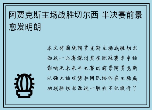 本文将围绕阿贾克斯主场战胜切尔西这一比赛,探讨其在欧冠赛季中的影响及未来半决赛的前景。阿贾克斯以强大的攻势和团队协作在主场成功战胜切尔西,这一胜利不仅提升了他们的士气,还使得他们在接下来的欧冠比赛中占...