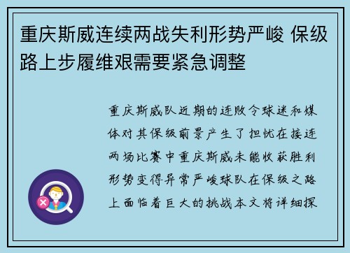 重庆斯威队近期的连败,令球迷和媒体对其保级前景产生了担忧。在接连两场比赛中,重庆斯威未能收获胜利,形势变得异常严峻,球队在保级之路上面临着巨大的挑战。本文将详细探讨重庆斯威连续两战失利的原因,分析当前...