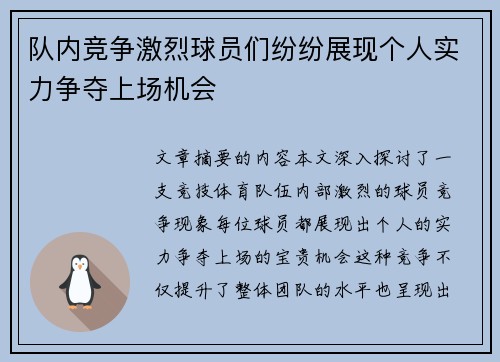 文章摘要的内容:本文深入探讨了一支竞技体育队伍内部激烈的球员竞争现象。每位球员都展现出个人的实力,争夺上场的宝贵机会。这种竞争不仅提升了整体团队的水平,也呈现出个性化的技术和战术风格,为球队的成绩和发...