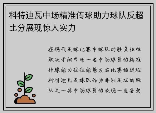 在现代足球比赛中,球队的胜负往往取决于细节,而一名中场球员的精准传球能力,往往能够左右比赛的进程。科特迪瓦足球队作为非洲足坛的强队之一,其中场球员的表现一直备受关注。特别是在近期的一场重要比赛中,科特...