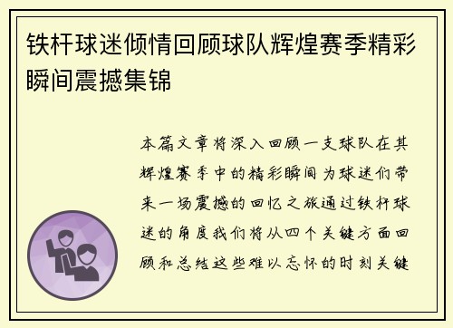 本篇文章将深入回顾一支球队在其辉煌赛季中的精彩瞬间,为球迷们带来一场震撼的回忆之旅。通过铁杆球迷的角度,我们将从四个关键方面回顾和总结这些难以忘怀的时刻:关键比赛的胜利,球员个人表现的闪耀,团队协作的...